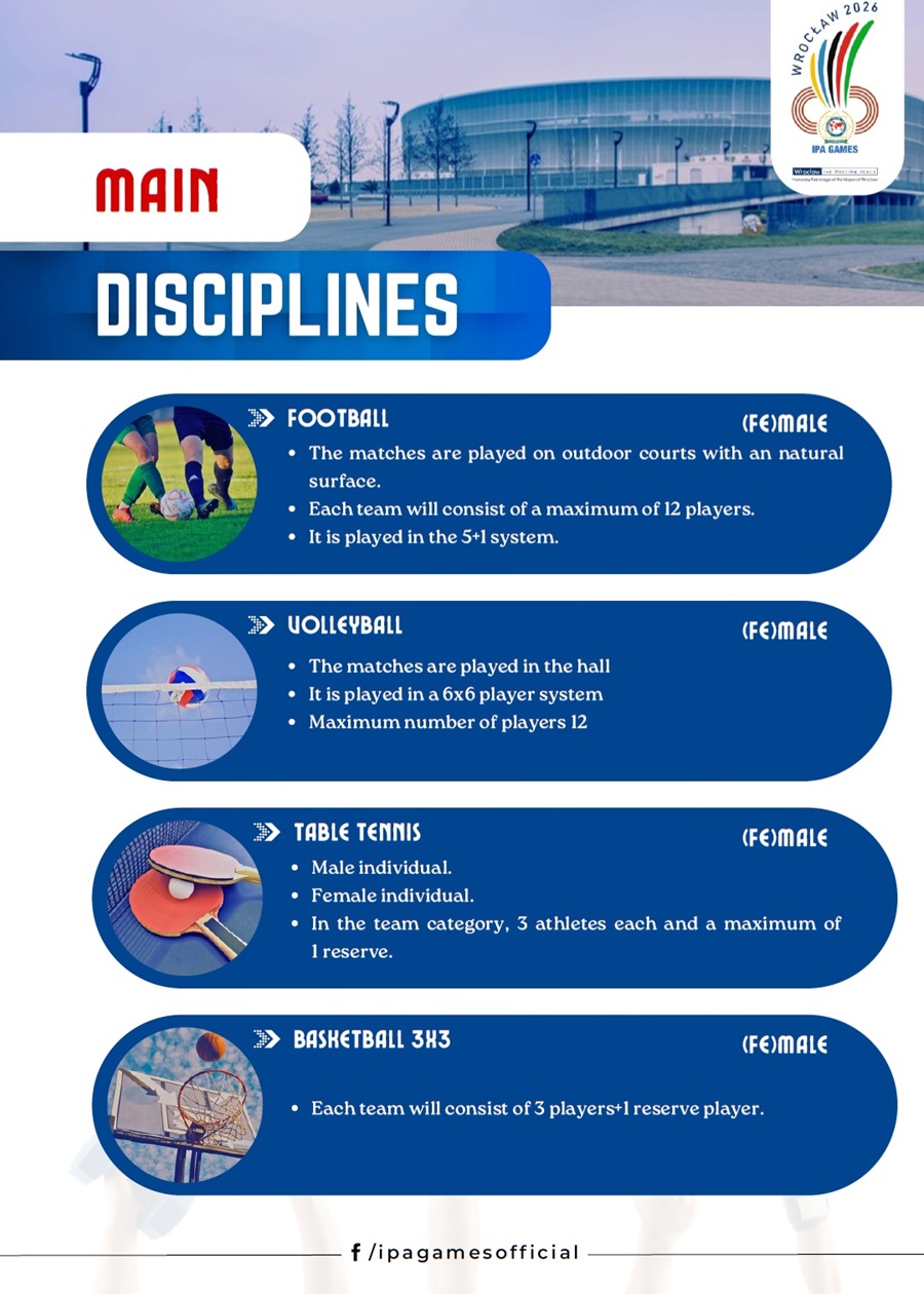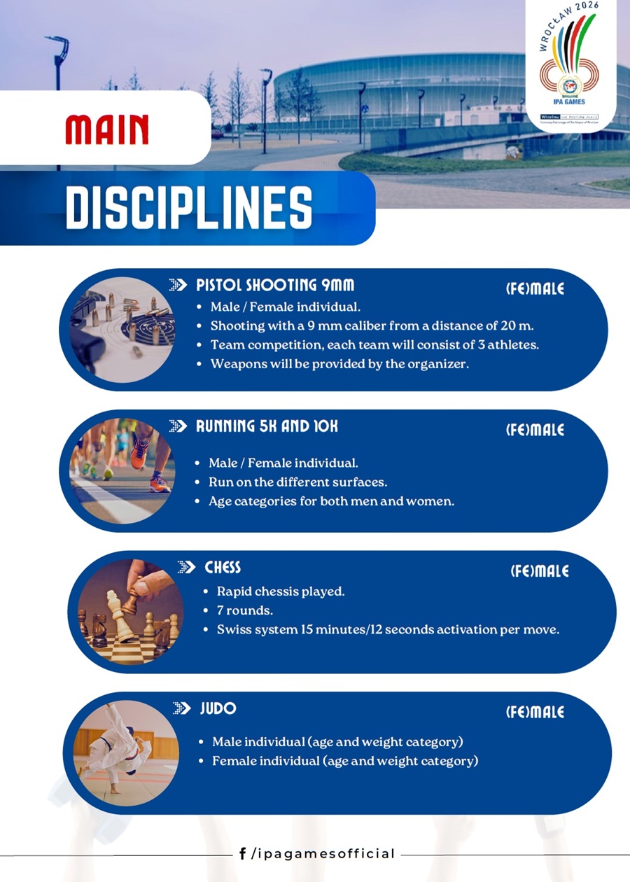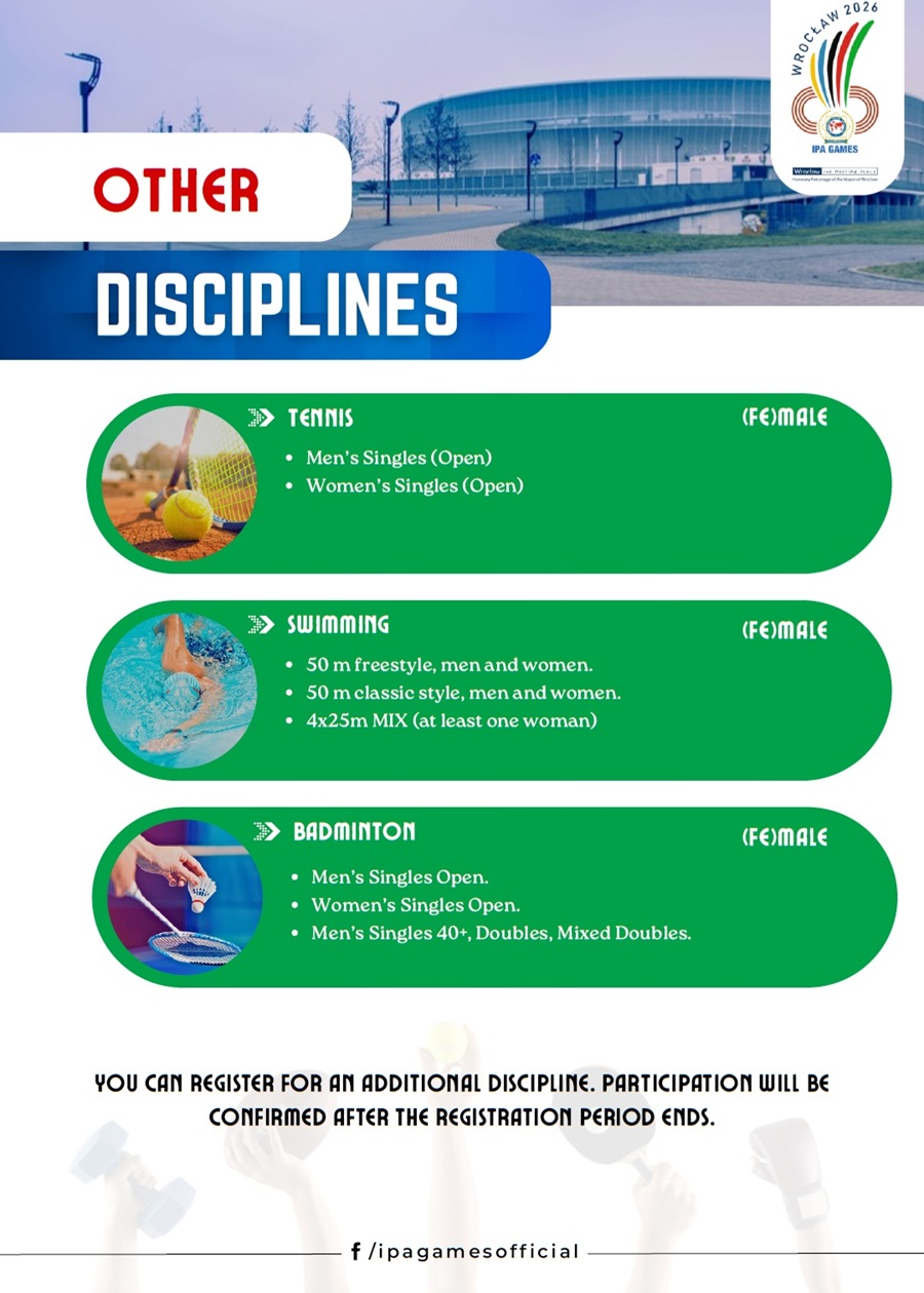 Člane in članice regionalnih IPA klubov obveščamo, da se je začel postopek registracije udeležencev IPA športnih iger 2026, ki bodo od 10. do 15. maja 2026 v mestu Wroclaw, Poljska. Prijave so možne samo in izključno preko nacionalne IPA sekcije, zato morajo kandidati za nadaljnje informacije kontaktirati upravni odbor regionalnega IPA kluba, katerega člani so.