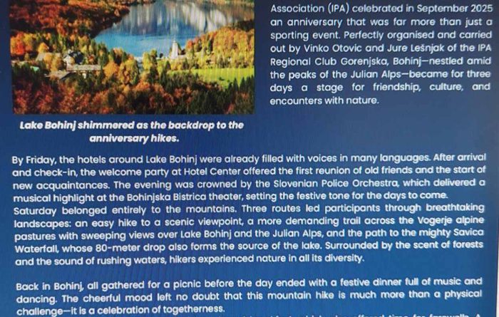 Praznovanje letošnje jubilejne 40. izvedbe planinskih dnevov je minilo v izredno lepem okolju v Bohinju in ob res prisrčnem druženju. Da so bili tudi gostje zadovoljni preberemo iz Mednarodnih IPA novic, kjer je začetnik IPA planinskih dnevov častni predsednik IPA Koroške Ewald Grollitsch opisal, kako je minilo praznovanje 40 let planinskih IPA dnevov.